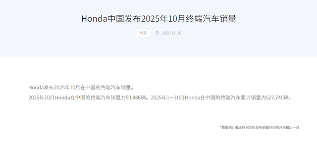10月份,本田中国终端销量为59,886辆,同比下降20.6%;今年1-10月份,累计销量为527,740辆,相较去年同期的663,626辆,同比下滑20.4%。