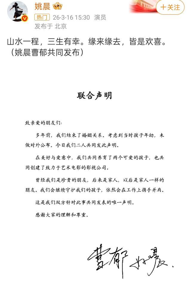 3月16日,知名女星姚晨突然发声明官宣和曹郁离婚,且强调她和曹郁早在很多年前就离婚了,只不过考虑到当时两个孩子年纪还小,为了保护孩子幼小的心灵,给孩子一个温馨的成长环境,所以俩人决定隐瞒离婚消息,没有公开。