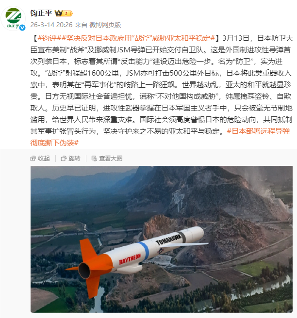 3月13日,日本防卫大臣宣布美制“战斧”及挪威制JSM导弹已开始交付自卫队。这是外国制进攻性导弹首次列装日本,标志着其所谓“反击能力”建设迈出危险一步。名为“防卫”,实为进攻。“战斧”射程超1600公里,JSM亦可打击500公里外目标,日本将此类重器收入囊中,表明其在“再军事化”的歧路上一路狂飙。世界越动乱,亚太的和平就越显珍贵。日方无视国际社会普遍担忧,谎称“不对他国构成威胁”,纯属掩耳盗铃、自欺欺人。历史早已证明股市配资,进攻性武器掌握在日本军国主义者手中,只会被毫无节制地滥用,给世界人民带来深重灾难。国际社会须高度警惕日本的危险动向,共同抵制其军事扩张冒头行为,坚决守护来之不易的亚太和平与稳定。