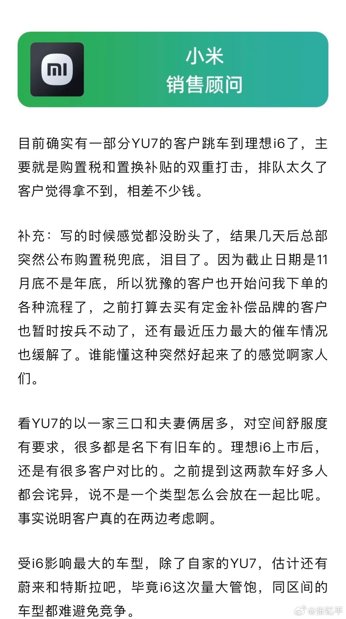 不过,该销售也指出,部分客户选择特斯拉的原因是认为品牌更好,还有5年免息和等车时间短等优势。选择小米的客户则主要觉得外观好看。